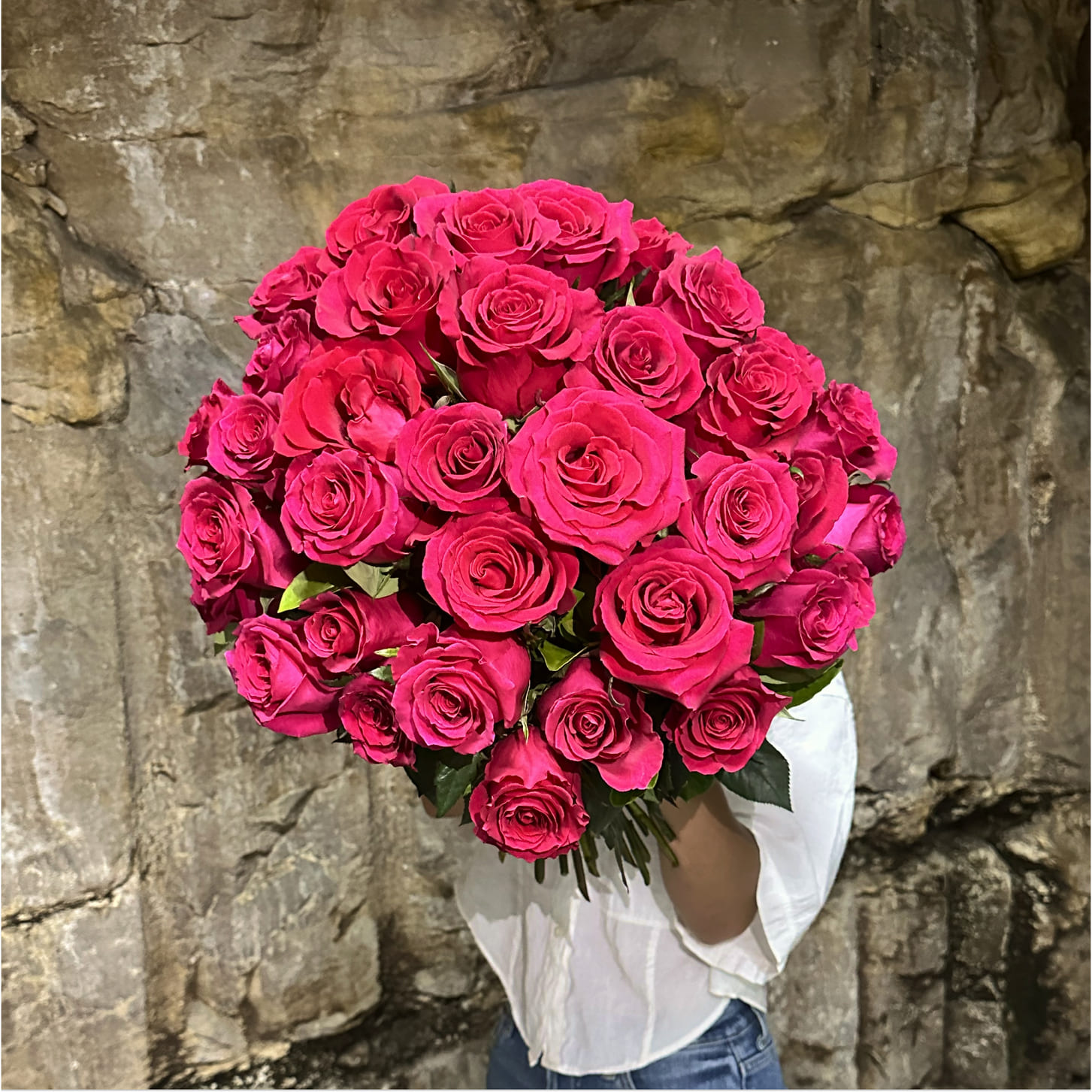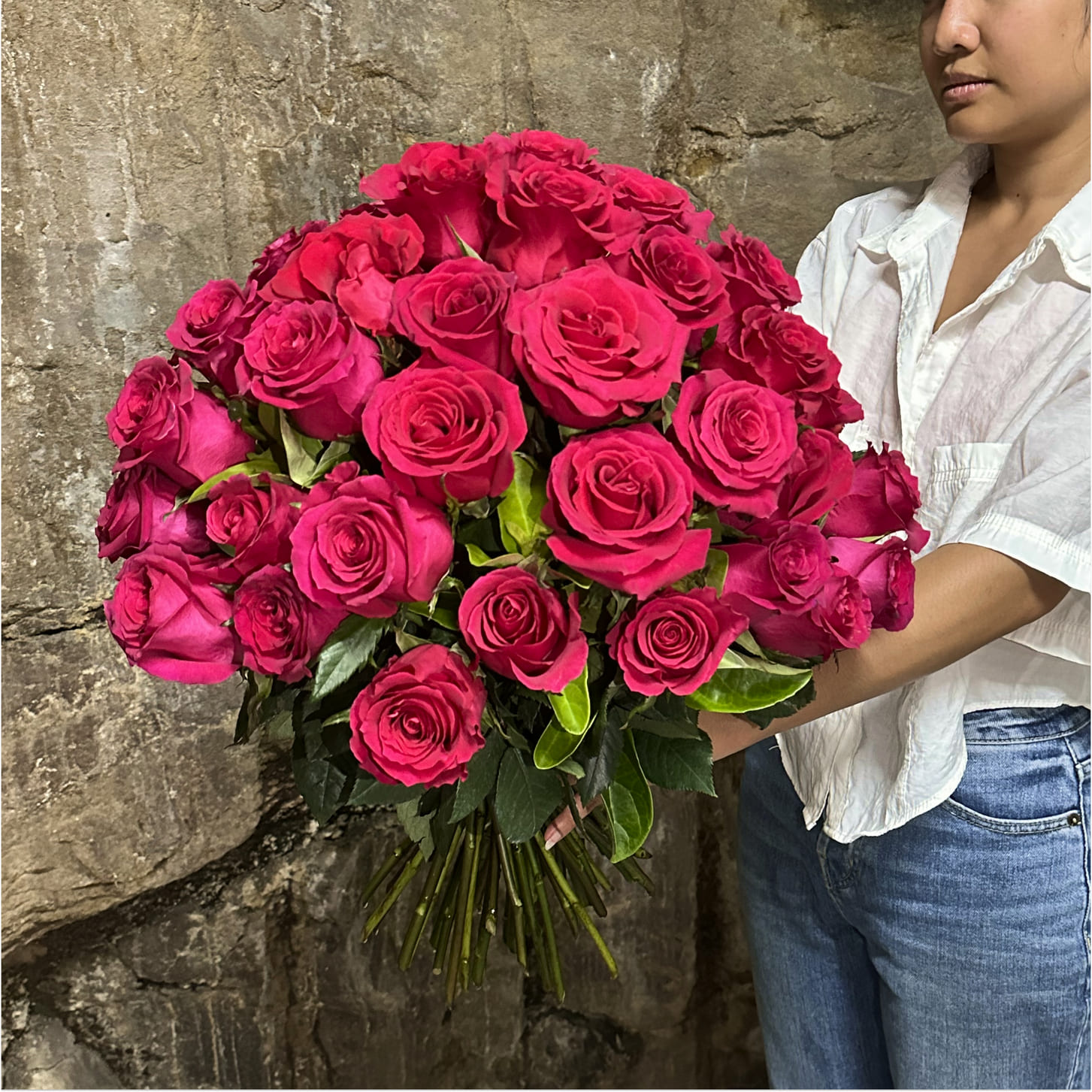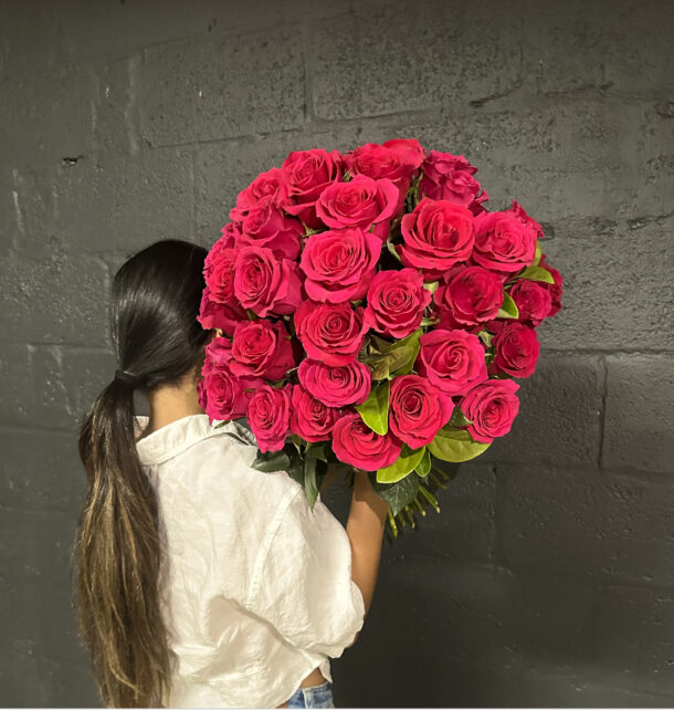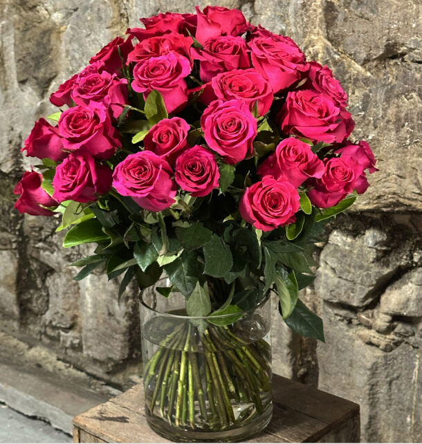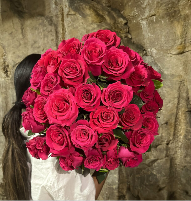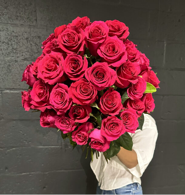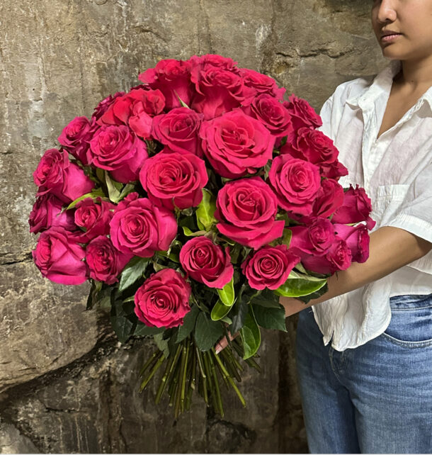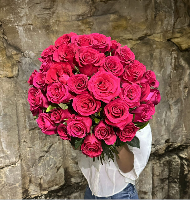 A lush bouquet of 50 premium long stem bright pink roses
