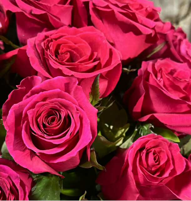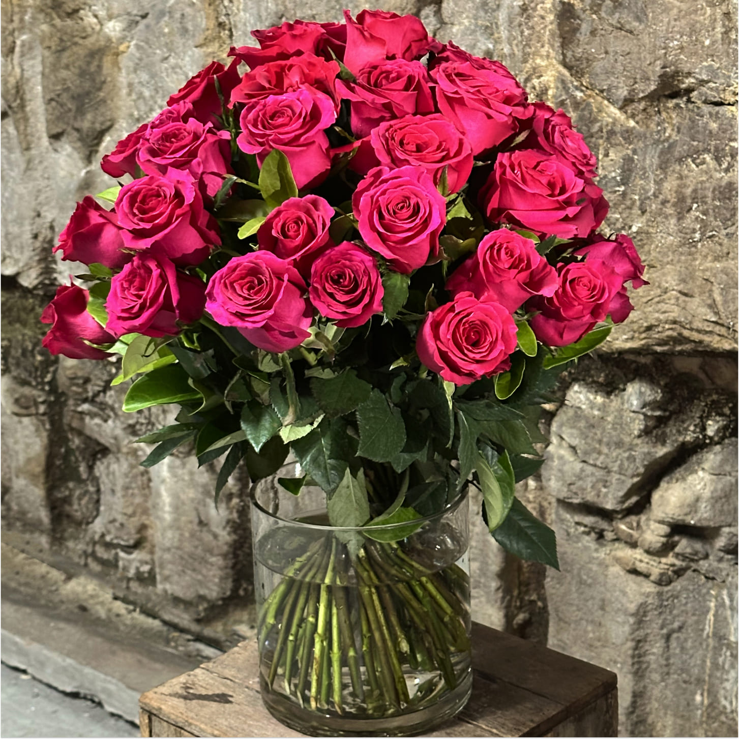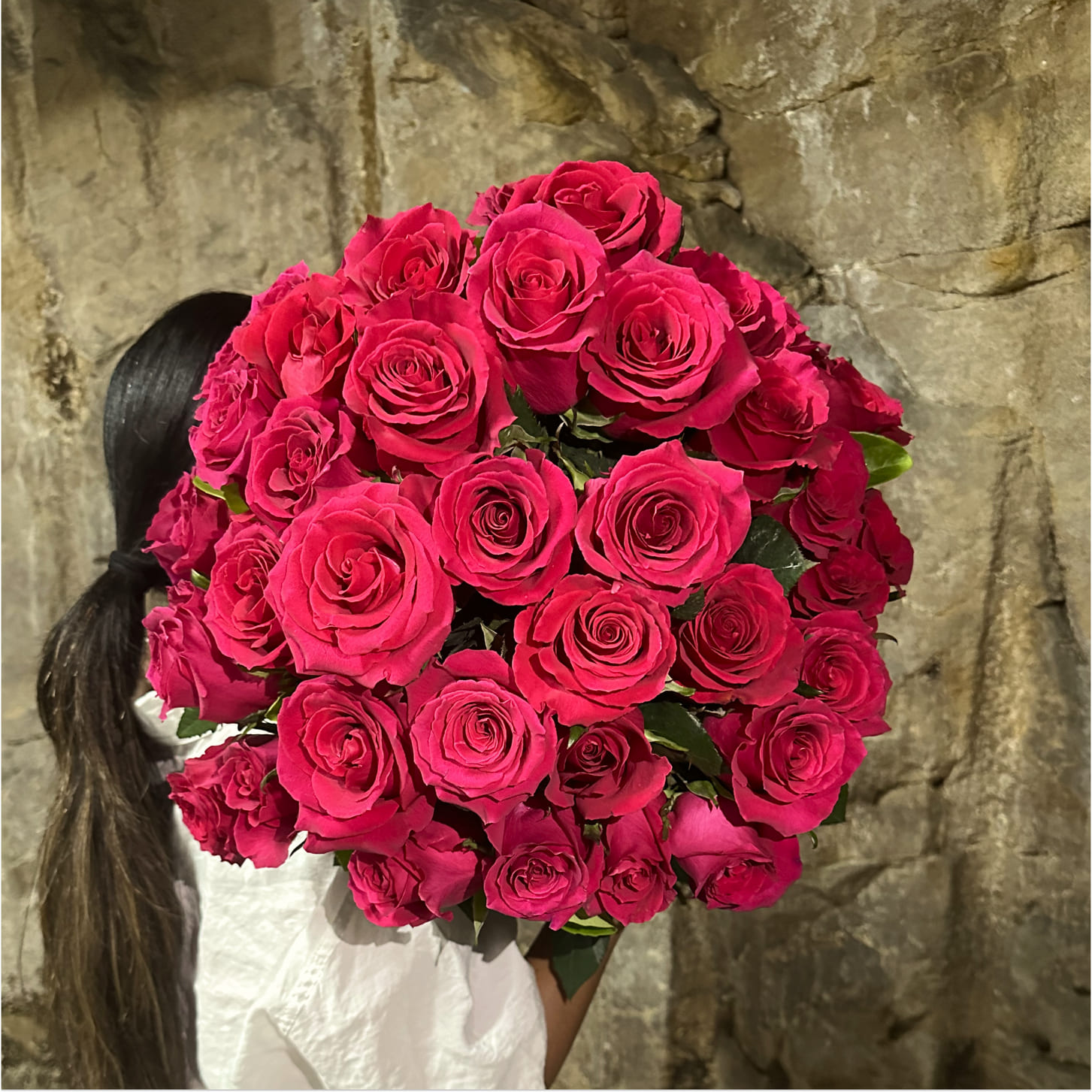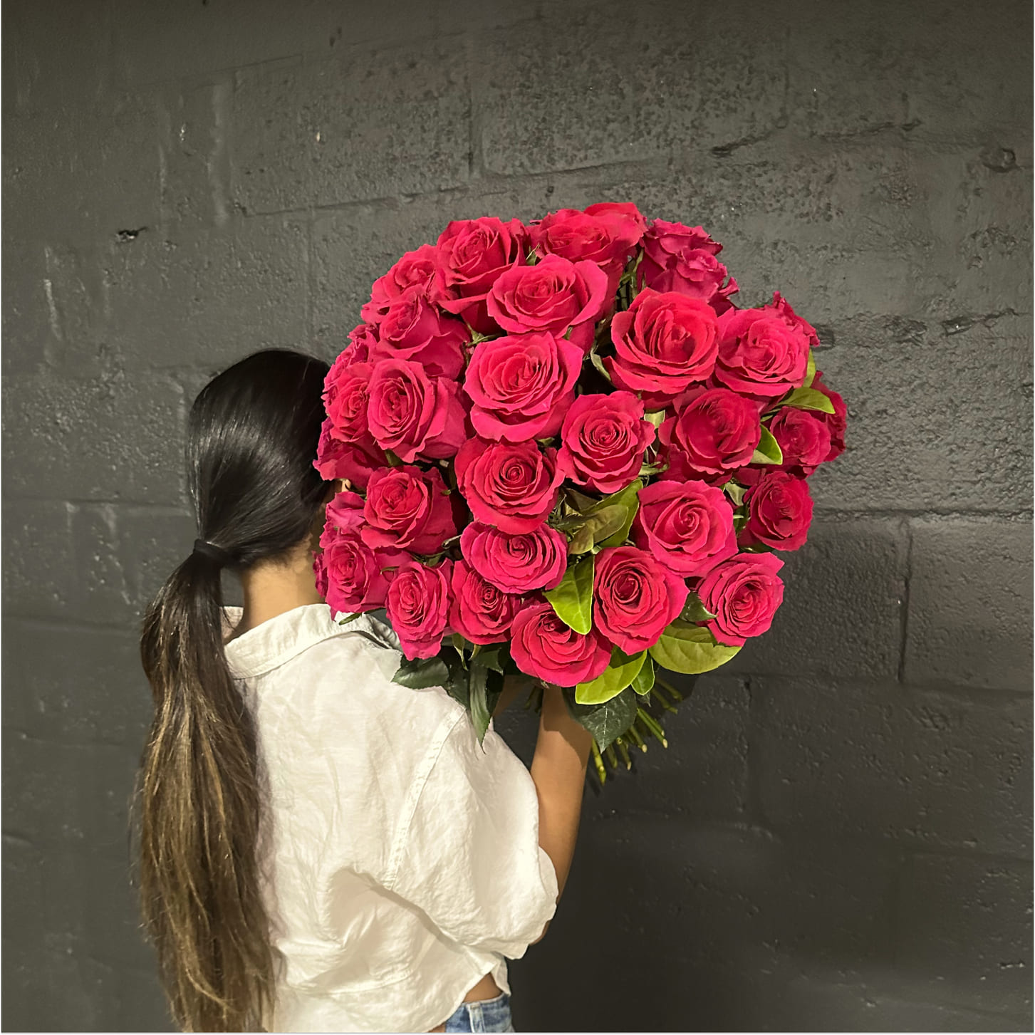 A lush bouquet of 50 premium long stem bright pink roses